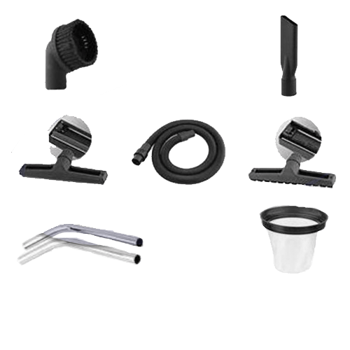 V kompletu poleg industrijskega sesalca dobite še 1,5 m dolgo sesalno pregibno cev premera 48 mm, dvo delno nepregibno sesalno cev iz nerjavečega INOX jekla dolžine 128 cm, ki jo lahko po želji razstavite (skrajšate za polovico na 67 cm), šobo za špranje in ostale ozke predele, 36 centimetrsko sesalno šobo za sesanje tekočin s tal, 36 centimetrsko sesalno šobo za sesanje suhih tal in šobo s 3 centimetrskimi ščetinami za sesanje prahu in trdovratnejših prilepljenih umazanij, katere odstranjujemo z drgnenjem.