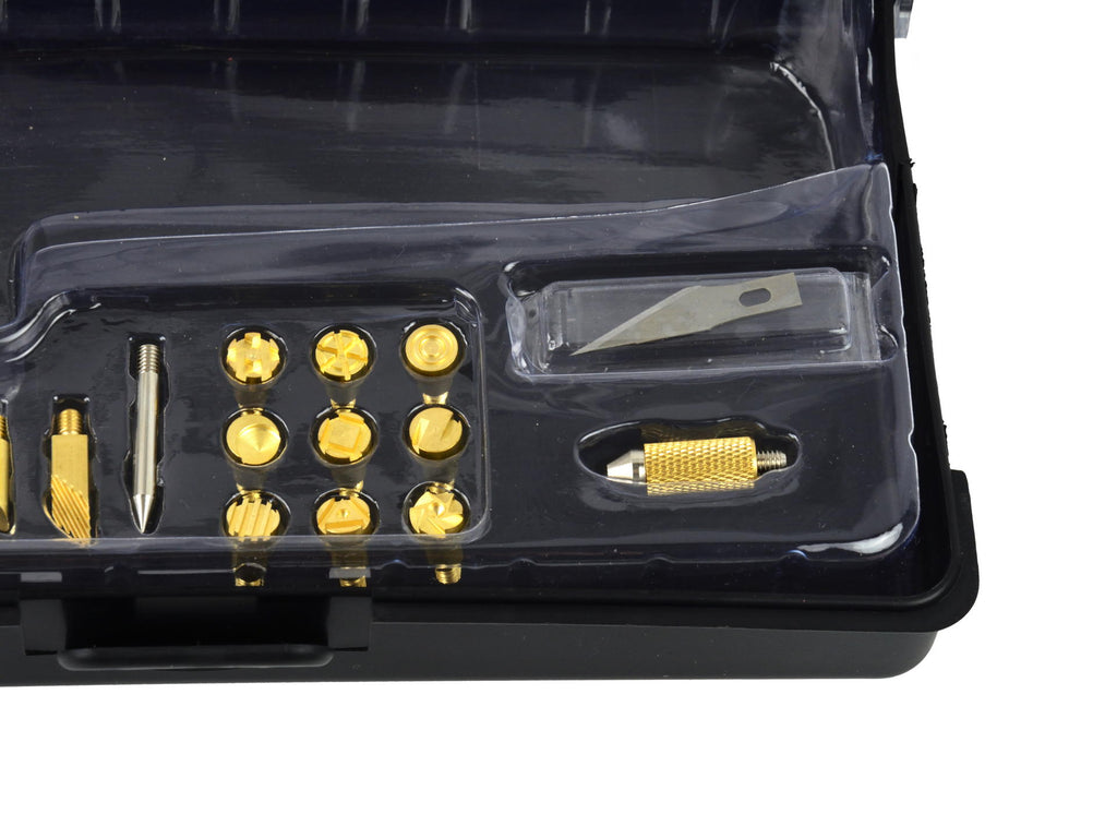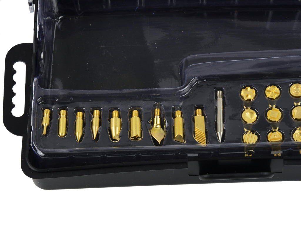 V kompletu je 22 različnih konic, pečatov, nožev in štampiljk za vžiganje. Uporablja se tudi kot rezalnik stiropora, kot spajkalnik manjše moči ali kot vroči nož za rezanje tkanin.
