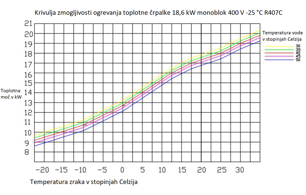 Toplotna črpalka ustvari največjo toplotno moč 18,6 kW pri porabljeni električni energiji 4,6 kW/h. Toplotna črpalka odvzema energijo iz okolja (anergija) in jo s pomočjo električne energije pretvori v uporabno toploto za ogrevanje stavbe. Toplotna črpalka proizvaja toploto pri temperaturi zraka zunanje okolice do -25 stopinj celzija. Čim toplejša je temperatura zunanjega zraka okolice, več energije lahko črpamo iz okolja.